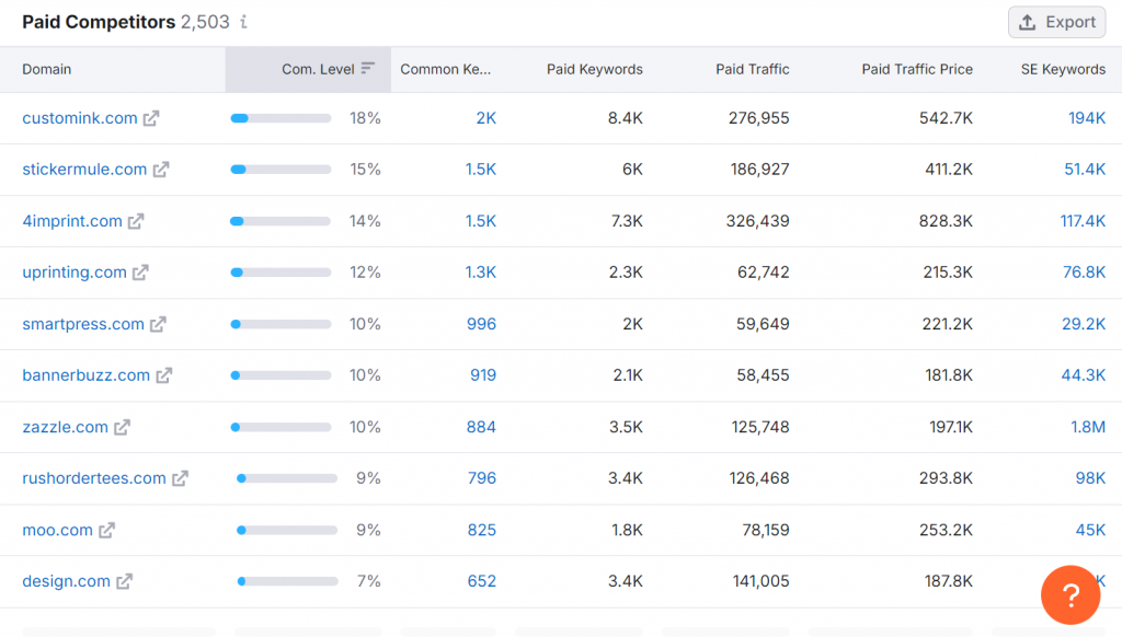 Analyze Competitors: Comparing your competitors can help your content team target keywords that your competitors are dominating, as well as identifying keywords where they have no presence. This knowledge can help you attract traffic from search engine users to your brand’s website and introduce them to your marketing funnel. Use tools like SEMrush to extract these keywords and gain valuable insights. For instance, by entering my company’s domain name into //www.semrush.com/, I can obtain a list of competitors, along with their paid keywords, paid traffic, and other relevant data.